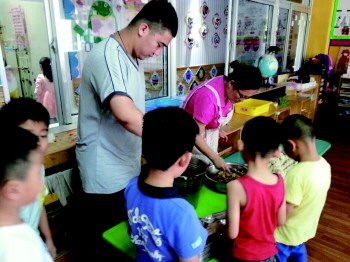 “每天和孩子们在一起,特别的开心和轻松。虽然有时候孩子哭闹或者调皮,但这些都不是事,他们都那么可爱。”午饭的时间,吴延军和班主任韩凤霞一起给孩子们配饭。而在午饭前,吴延军要带孩子们洗手然后排队,排队等候的时间还要和孩子们一起背儿歌。