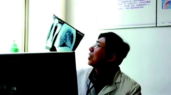 潍坊市第二人民医院(潍坊呼吸病医院)呼吸与危重症医学科主任张绍坤为患者阅片。