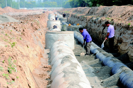 据该路段的施工项目经理王友连介绍,从9月1日正式启动路段的施工,目前处于地下管道的敷设阶段。“整个地下管网总长度达到8千米。包括雨污分流管道、自来水管道、燃气管道、电力沟槽等。”王友连说,现在施工进行的主要是敷设雨污分流管道,管道直径最大的达到2米,目前已经接近尾声,预计这个月底前完成整个地下管网的敷设工作。
