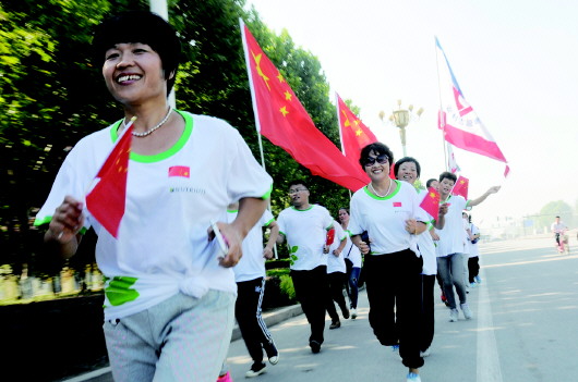 日前,50多名市民手持国旗健康开跑。(资料图) 本报记者 邓兴宇 摄
