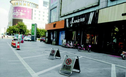 3家店铺放置障碍物禁止停车。 本报记者 郗运红 摄