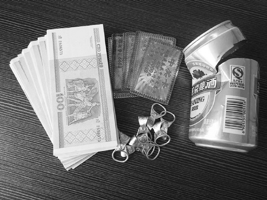 从嫌疑人的行李中查获了假币、中奖卡、易拉罐。