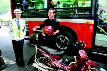 市民张先生在领到免费安全头盔后说:“以后我会提高交通安全意识,骑车时一定会把交警发给我的头盔戴上。”
