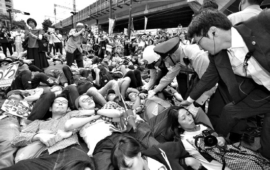16日,在横滨,示威者躺在即将举行安保法案听证会的酒店前抗议。 新华/美联
