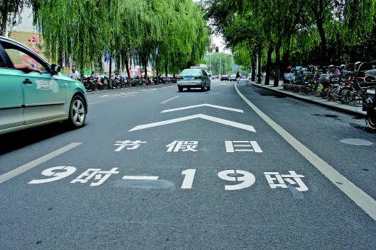 16日,在黑虎泉西路,南侧机动车道开始喷涂“节假日”、“9时—19时”等字样。据交警介绍,为配合老城区无车日活动,黑西路、黑北路等路段将设立节假日公交专用车道,确保公交优先,打造慢生活街区。 本报记者 周青先 实习生 刘海天 摄