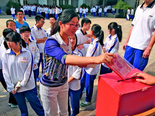 山师附中师生为癌症女孩捐款。 本报记者 李飞 通讯员 张静婷 摄