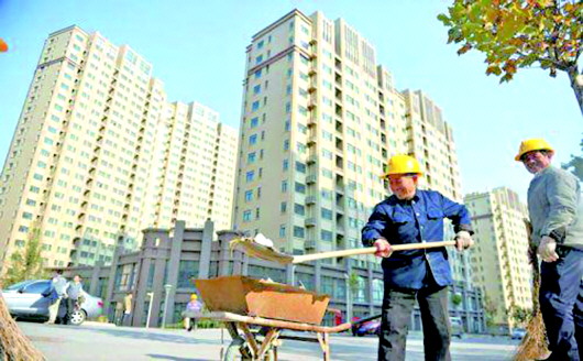 2014年11月14日,西蒋峪保障房小区,施工人员正在进行最后的打扫。(资料片) 本报记者 王媛 摄