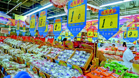 16日,济南一家大超市,一元一个的月饼被放在最醒目的地方,深受消费者欢迎。前几年月饼走向了贵族化、高价化,如今高价月饼已经鲜见,月饼回归本来面貌。 本报记者 周青先 摄