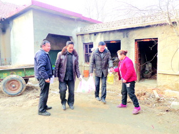 春节期间,冯磊(右二)和村委工作人员为困难村民送去生活用品。