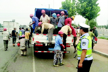 15日下午,民警在黄岛白马河桥附近巡逻时发现一辆情况异常的小货车。民警下车检查,发现5平方米左右的车斗里竟然密密麻麻站了42个工人。民警让“乘客”分批乘坐过往的客车前往工地,司机被罚款500元记6分。