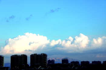 九月的日照,蓝天与白云相衬,清晨白云与山环绕,白天白云低垂,人儿走在路上仿佛触手可及,放眼望去或铺洒开来,或云卷与舒。