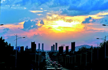 ▲傍晚的山东路上,成片的火烧云十分壮观。