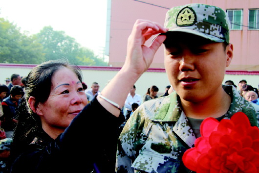 一位新兵的家长仔仔细细地给孩子把帽子带上。
