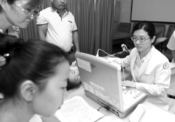 9月16日,聊城市第三人民医院小儿先天性心脏病赴韩国接受免费手术治疗的筛查工作开始了。聊城市第三人民医院与韩国光明市世宗医院结为友好医院,已连续七次组织免费筛查工作。图为韩国世宗医院专家为患儿进行筛查。(王吉东)