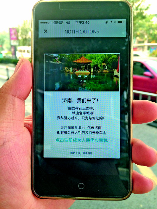 9月17日早上,细心的市民会发现,优步手机客户端发出了“招募车主,并即将进入济南”的消息。该通知的背景图案为济南5A级景点趵突泉,通知内容为:济南,我们来了!四面荷花三面柳,一城山色半城湖,我从远方走来,只为与你赴约!