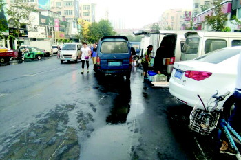延安二路上的自发海鲜市场已经存在十几年了,每年这个季节,这条婚纱街就变成了螃蟹批发一条街。每天凌晨三点半开始,从菜市二路路口到威海路路口,延安二路东侧短短几百米的距离就被十多辆批发螃蟹的大货车和前来进货的面包车、三轮车占据,最严重时能占去四个车道。有的商户甚至在马路中间支起了小桌子,收钱记账。除了随意倾泻海水,乱扔垃圾,占路经营,这些货车进出这一路段也十分随意。