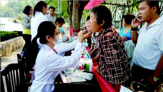9月20日是“全国爱牙日”,今年爱牙日的主题是“定期口腔检查,远离口腔疾病”。17日上午,滨州市人民医院口腔科的专家们进行了普及口腔保健知识的讲座和义诊。在义诊中发现,定期检查口腔的市民非常少,而大多数幼儿更是从未进行过口腔检查。图为医生正在为市民做口腔检查。