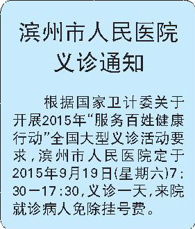 根据国家卫计委关于开展2015年“服务百姓健康行动”全国大型义诊活动要求,滨州市人民医院定于2015年9月19日(星期六)7:30—17:30,义诊一天,来院就诊病人免除挂号费。