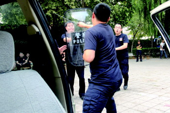 17日下午,面对民警检查,心虚的“歹徒”突然从车座上抽出了砍刀,几名民警持盾牌和警棍与“歹徒”搏斗。这令人紧张的一幕发生在市公安局统一组织的一线民警实战化培训中。今年市公安局组织千余名一线民警接受培训,提高他们的综合素质和应对各种复杂疑难警情的实战处置能力,全面提升现场执法工作的规范化、专业化水平。 本报见习记者 李洋 摄影报道