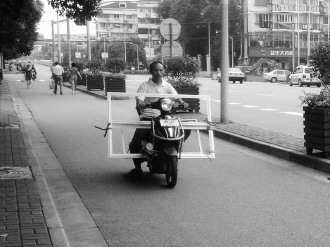 时间:2015年8月31日 自述:路上看见一大叔骑着电动车,踏板上放着铝合金窗的框架,一路疾驰而过。 点评:看着天挺阴,赶着去装窗户的心情可以理解,但为了安全起见咱下次雇一辆小货行不。