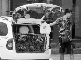 时间:2015年8月31日 自述:汽车后盖一打开,就成了卖葡萄的货架,车主真是机智啊,佩服! 点评:不光是卖货方便,要是城管来了也方便啊,后门一关直接溜了,都不用收摊。