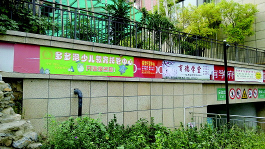 ◥小区外墙,各种小饭桌、托管机构的广告。