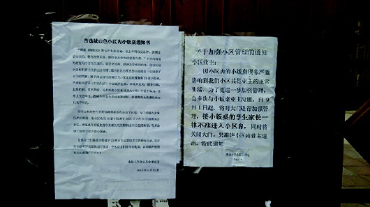 与此同时,原本敞开的小区大门如今也关了起来,通知书旁边贴的另一张告示上称,9月1日起,小区对大门进行加强管理,“接小饭桌的学生家长一律不准进入小区内”,只准许小区内业主进出。