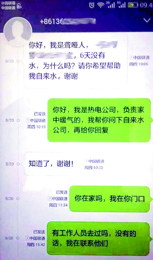 8月20日,济南热电供热公司六里山班组职工刘斌入户回访七里山南村热用户,向每个家庭发放《济南热电用热信息一点通手册》和便民服务卡。这时,刘斌突然接到一个的短信,短信中,对方称自己是一名聋哑人,而其家中已经6天没有自来水了。