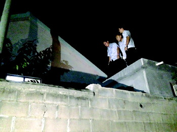 执行人员爬到平房上查看被执行人是否在家。 周衍鹏 摄