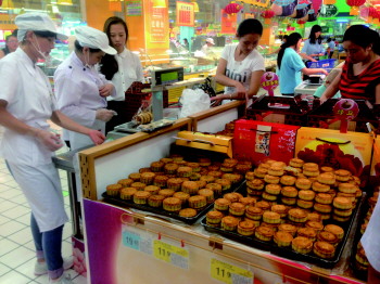 22日,在大润发超市,记者看到一条约30米长的“月饼街”,不少顾客在里面选购月饼,“今年月饼礼盒还是挺好卖的,比去年销量要好很多。”大润发超市促销员说,今年多数月饼礼盒是买一送一,价格在100到150元之间,有的顾客一下子就来买好几盒,很受欢迎。“感觉礼盒明显比去年便宜了好多,去年礼盒都在200元左右,今年才100元出头,再说,中秋节到了,买一些送亲戚朋友也不为过。”正在选购月饼的李先生告诉记者。
