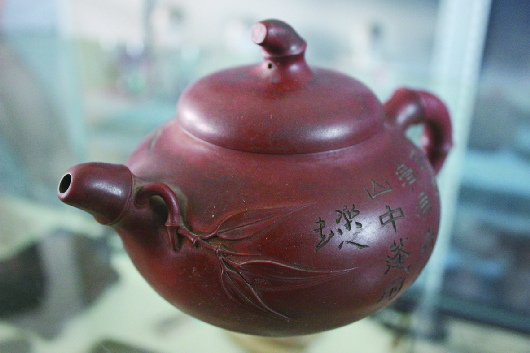 紫砂壶:整体造型为柿子壶,吕俊杰制壶,壶把手和壶嘴处有竹节,壶身字画出自鲍志强之手,壶底、壶盖、壶把手等部位盖有印章。参考价格:15万元