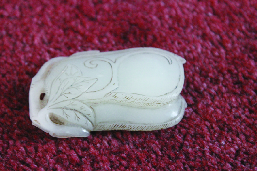 ◤明代和田羊脂玉佩:图案为一对扁豆,从明代一位大学士的子孙手中购买。参考价格:10万元