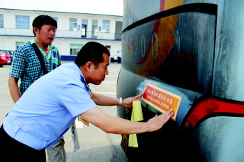 民警对违法车辆贴禁止营运标志。(资料片)