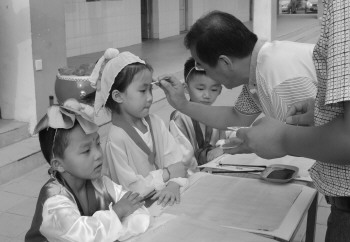 与会领导与老师给小学生们进行“朱砂启智”。本报记者 张跃峰 通讯员 李莎 摄
