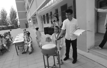 小学生们在“开笔礼”仪式上击鼓明志。