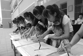 小学生们在启蒙描红环节用毛笔书写“人”。本报记者 张跃峰 通讯员 李莎 摄
