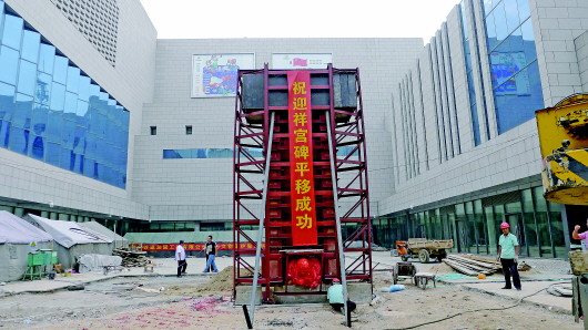 23日,正在进行拓宽改造的舜井街工地上,原来位于舜井边的元代古碑“迎祥宫碑”平移完成。迎祥宫碑因由同是济南人的张养浩、张起岩“二张”师徒合书碑刻而声名显赫。2011年9月舜井街改造时该碑曾经被平移过一次,如今再次被平移,侧面显示出济南古城的变化之快。 本报记者 周青先 摄