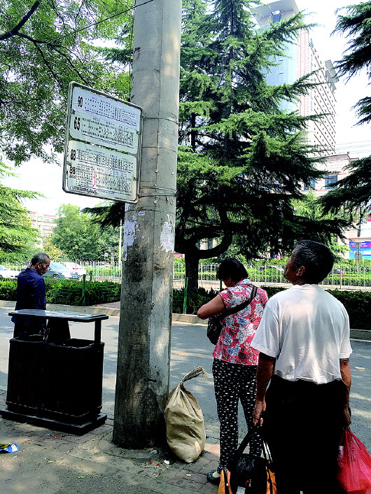站牌太高,乘客需仰视。 见习记者 郭立伟 摄