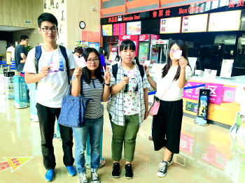 几名同学手持电影票在影院内合影。本报记者 庄子帆 摄