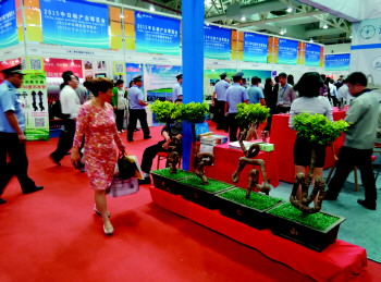 在23日的中日韩产业博览会现场二楼,一些市民围观几盆盆栽盆栽。展商彭先生告诉记者,这种盆栽的名字叫做金叶榆。四盆金叶榆的枝干模仿“草书汉字”的样式,分别长成“寿”、“比”、“南”、“山”四个汉字的模样。彭先生介绍,这种长成汉字的盆栽,是他们的种植基地经过10年左右的时间培育而成,枝干长成汉字模样,树冠则是亮丽的金元宝模样,他们的这项独特培育,在2010年获得两项国家专利,并获得了2013年中国花博会的金奖。