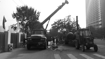 近日,广川大道天衢路至大学路段开始动工修建,预计明年通车,但因特殊原因,天衢路北侧的数十棵行道树被工作人员挪走。 本报记者 徐良 摄