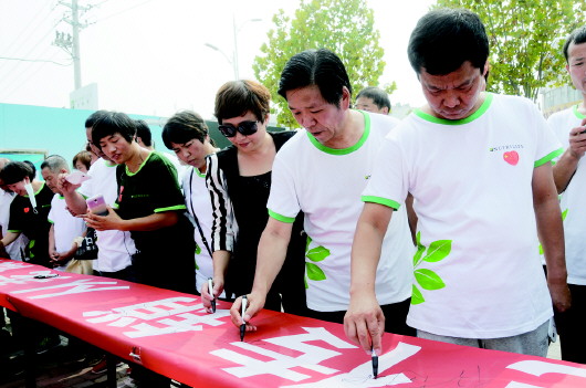 民众在反传销横幅上签名。 本报记者 邓兴宇 摄