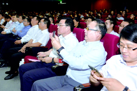 与会嘉宾现场纷纷扫码下载齐鲁壹点客户端。 本报记者 郭建政 摄