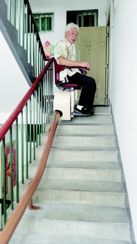 ▲北京住宅楼内首个座椅电梯安装者金先生体验上下楼。 本报记者 孟燕 摄