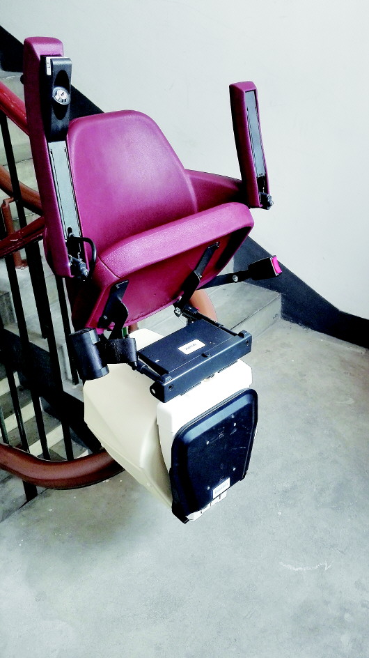 记者注意到,智能化座椅电梯架设在距离楼梯10厘米左右的轨道上,轨道由立柱支撑,与楼梯扶手平行。记者体验发现,座椅电梯的操作非常简单,坐在皮椅上,双脚放置在脚踏板上,只需扳动右手扶手处的“拨片式”按钮,就能实现上行或下行。电梯运行缓慢平稳,比老年人爬楼梯的速度稍快,运行时很安静,噪音较小。为保障安全,座椅电梯上配有可伸缩安全带,脚踏板上配有安全开关网,一旦遇到障碍物,设备会自动停止。“座椅电梯载重137公斤,不破坏楼梯结构。还配有遥控器,可以远程召唤机器运行。不使用的时候,脚踏板、座椅、扶手都可折叠,节省空间。”陈明辉介绍,电梯由蓄电池驱动。“耗电量很小,每天也就一两度电。”