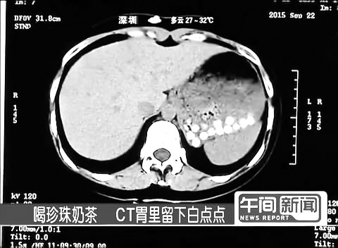 有媒体记者体验喝珍珠奶茶,照CT时在胃里发现清晰白点。医生推测,这说明这些“珍珠”里含有人体不能消化的物质,人吃了存在堵住肠胃甚至导致小肠梗阻的危险。