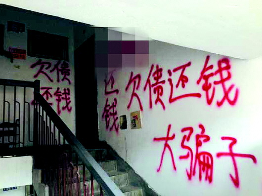 楼道墙壁被写上“欠债还钱”,锁眼被灌油漆。