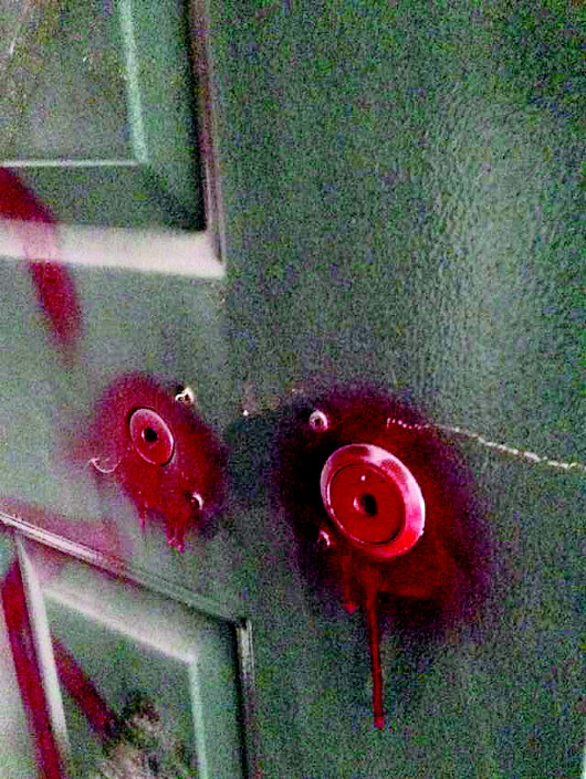 23日晚上9点多,601的房主周女士跟丈夫一起下班回家,进了单元大门就听到楼道里乱糟糟的,刚走上五楼,吓了周女士一跳,楼道里被红漆喷满了“欠债还钱”的大字,十分醒目。而被讨债的当事人正是周女士对门的邻居。走到家门口,周女士发现有三个身材高大的男子,“都剃着光头,还有文身,手里拿着大砍刀和斧头。”见此情况,周女士比较害怕就想赶紧回家,可是掏出钥匙发现自己家的锁眼被什么给堵住了,开不了门,“后来换锁的师傅说锁眼被502胶水堵死了。”