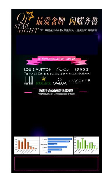 继去年9月首次发布“山东人最喜爱的十大奢侈品牌”受到广大读者和业界热烈反响的背景下,今年8月,齐鲁晚报联合贵和购物中心又发起了“2015(第二届)山东奢侈品消费星光榜”调查,意在将本年度山东消费者对于奢侈品的认知喜爱度、消费习惯等信息收集、整理、分析,还原一个真实的山东奢侈品消费市场。本次调查一经启动,就受到了各方的广泛关注,在历时一个多月的调查周期内,共收到来自报纸、手机、网站三大投票平台的有效投票累计达到十余万条,对各方投票加以汇总统计后,最终产生“山东人最喜爱的十大奢侈品牌”榜单,路易威登、卡地亚、古琦、蒂芙尼等时尚大牌榜上有名,上榜品牌涉及服饰、箱包、珠宝、腕表、化妆品等各大时尚品类。作为第二届山东省奢侈品消费调查,“2015齐鲁星光榜”调查评选为省内消费者与时尚奢侈品牌提供了坚实可信的市场数据, 对各大品牌在山东开展区域营销活动亦具有重要的参考价值。