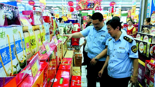 在明水街道办事处双泉路一家大型超市,经食药监管人员检查,其所销售月饼的生产许可表示、生产批号和生产日期等均齐全。监管人员表示,在挑选散装月饼时,应尽量在正规商超购买,并注意查看月饼销售标签上的生产日期和配料信息等。